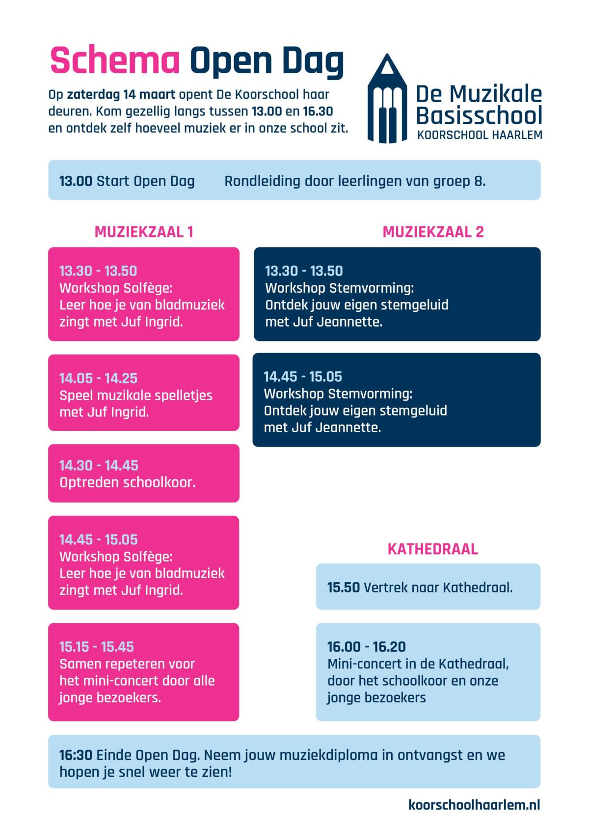 Op zaterdag 14 maart 2026 van 13:00 - 16:30 uur is er op De Koorschool, dé muzikale basisschool in Haarlem, Open Dag. Speciaal voor kinderen die gek zijn op zingen en muziek. Het wordt één grote muzikale ontdekkingsreis met als hoogtepunt: een mini-concert in de Kathedraal. Na afloop gaan jullie naar huis met een muziekdiploma op zak!