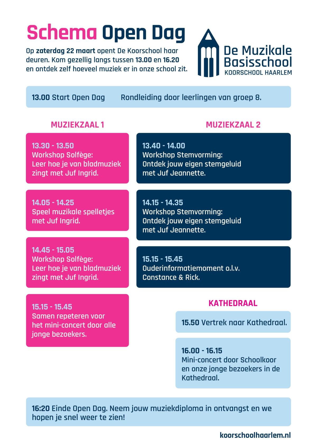 Op zaterdag 22 maart 2025 van 13.00 uur tot 16.30 uur is er op De Koorschool, dé muzikale basisschool in Haarlem, Open Dag. Speciaal voor kinderen die gek zijn op zingen en muziek. Het wordt één grote muzikale ontdekkingsreis met als hoogtepunt: een mini-concert in de Kathedraal. Na afloop gaan jullie naar huis met een muziekdiploma op zak!